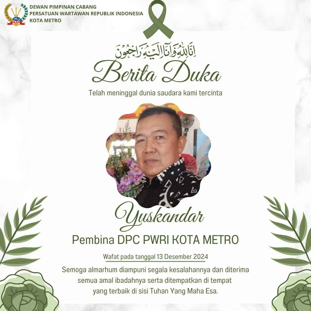 WARTAMANIA — Kabar duka menyelimuti keluarga besar Persatuan Wartawan Republik Indonesia (PWRI) DPC Kota Metro. Salah satu anggotanya yakni Dewan Pembina, Yuskandar bin Hi.Muhammad Arsad Toyeb telah berpulang ke rahmatullah pada Jumat, 13/12/2024, pukul 04.00 WIB di Rumah Sakit Umum Ahmad Yani, Metro.
