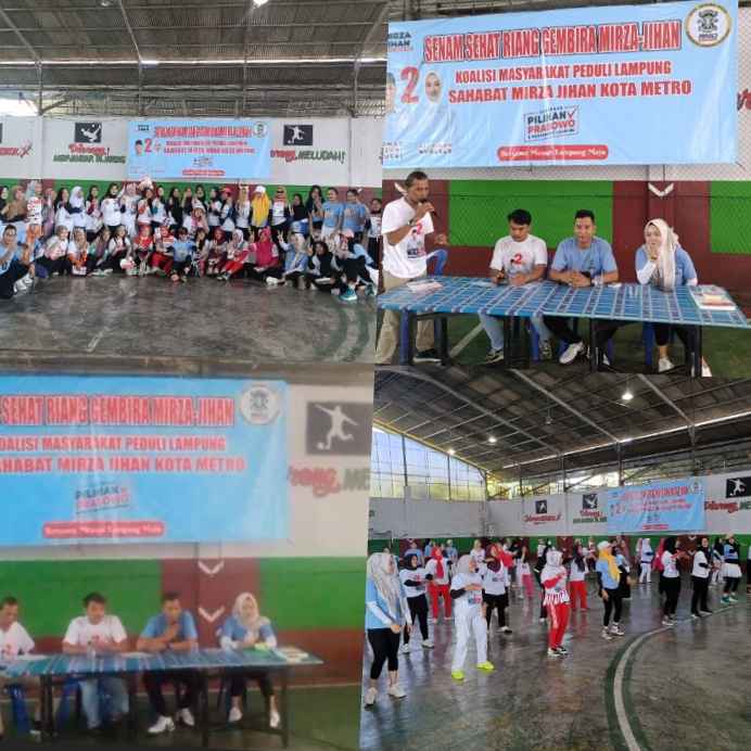 METRO LAMPUNG — Organ Relawan KMPL (Koalisi Masyarakat Peduli Lampung) Sahabat Mirza Jihan Kota Metro Lampung mengadakan Senam Sehat Riang Gembira Mirza-Jihan Minggu Pagi 27 Oktober 2024, yang berlangsung di Gedung Futsal Wawai, Prasanti Blok A 10, Metro Pusat Kota Metro Lampung,