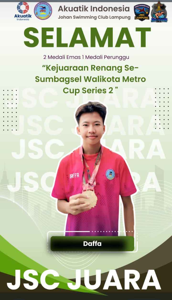 WARTAMANIA — Daffa Dzakwan Kusuma Atlet renang asal sekolah menengah pertama (SMP) IT Smart Insani Lampung Tengah torehkan prestasi pada event bergengsi kejuaraan open Metro swimming series ll piala Walikota Metro CUP tahun 2025.